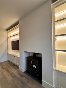 The finished result is a beautifully balanced alcove media wall that feels purpose-built for the room. The electric log burner creates a cosy focal point, while the bespoke cabinetry provides practical storage and elegant display space.